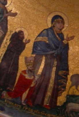 A su derecha de la cruz (nuestra izquierda) se encuentra la Virgen María, Madre de la Iglesia, revestida de majestad y ternura. Junto a ella se inclinan san Pedro y san Pablo, columnas apostólicas, y más abajo (añadidos en el siglo XIII), san Francisco de Asís y el papa Nicolás IV, como testigos de la renovación espiritual que brota del evangelio.